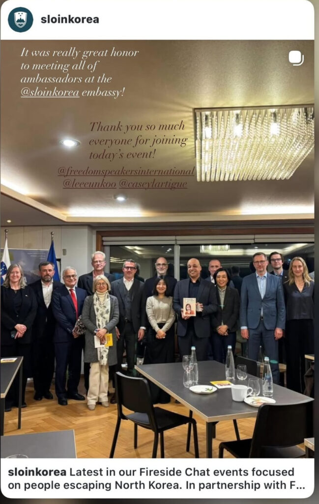 주한 슬로베니아 대사관의 초청으로 프리덤스피커즈인터내셔널(FSI)은 3월 20일 탈북민 한송미씨와 특별 행사를 진행하였습니다. 이번 행사는 한송미 씨가 FSI 대외협력 매니저로서 대사관과의 협력을 이어가는 과정에서 성사되었으며, 행사 당일에는 주한 슬로베니아 대사가 직접 행사의 취지와 진행 방식을 소개하며 자리를 열었습니다. 참석자로는 EU, 스위스, 뉴질랜드, 에스토니아, 리투아니아 등의 대사 및 관계자들 16명이 참여하였습니다.